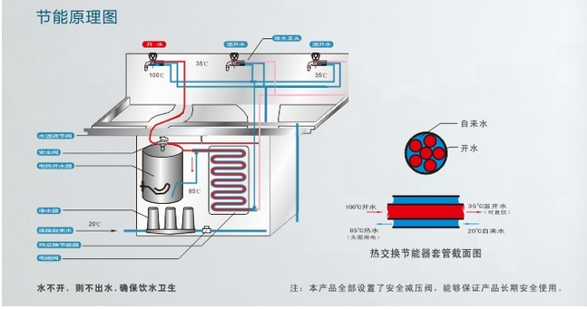 采用热交换应用技术,流出的开水经过热交换器释放热量而冷却成温开水的同时,让进来的冷水在进入开水器之前吸收热量预热接近至开水温度,从而极大限度地节省了将水烧开所需的电能和时间,彻底改变了传统饮水机耗时、耗电的缺点。