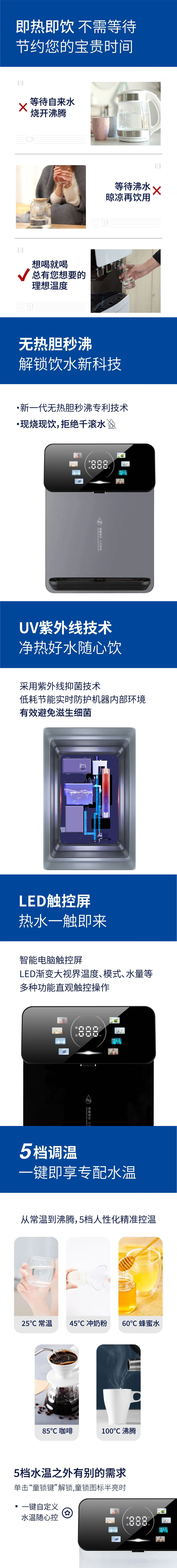 机器设计小巧精美,功能强大,温度随心而定,可出常温、温水、热水,满足直饮、冲奶、泡茶等饮水需求,满足您随时取水无需等待,有童锁更安全。