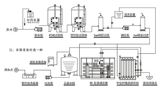 方案二、预处理系统→RO系统→后处理系统→用水点